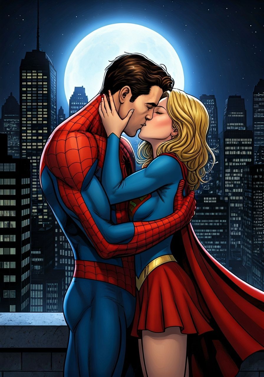 Spiderman and Supergirl share a romantic kiss on a moonlit rooftop, surrounded by city skyscrapers.