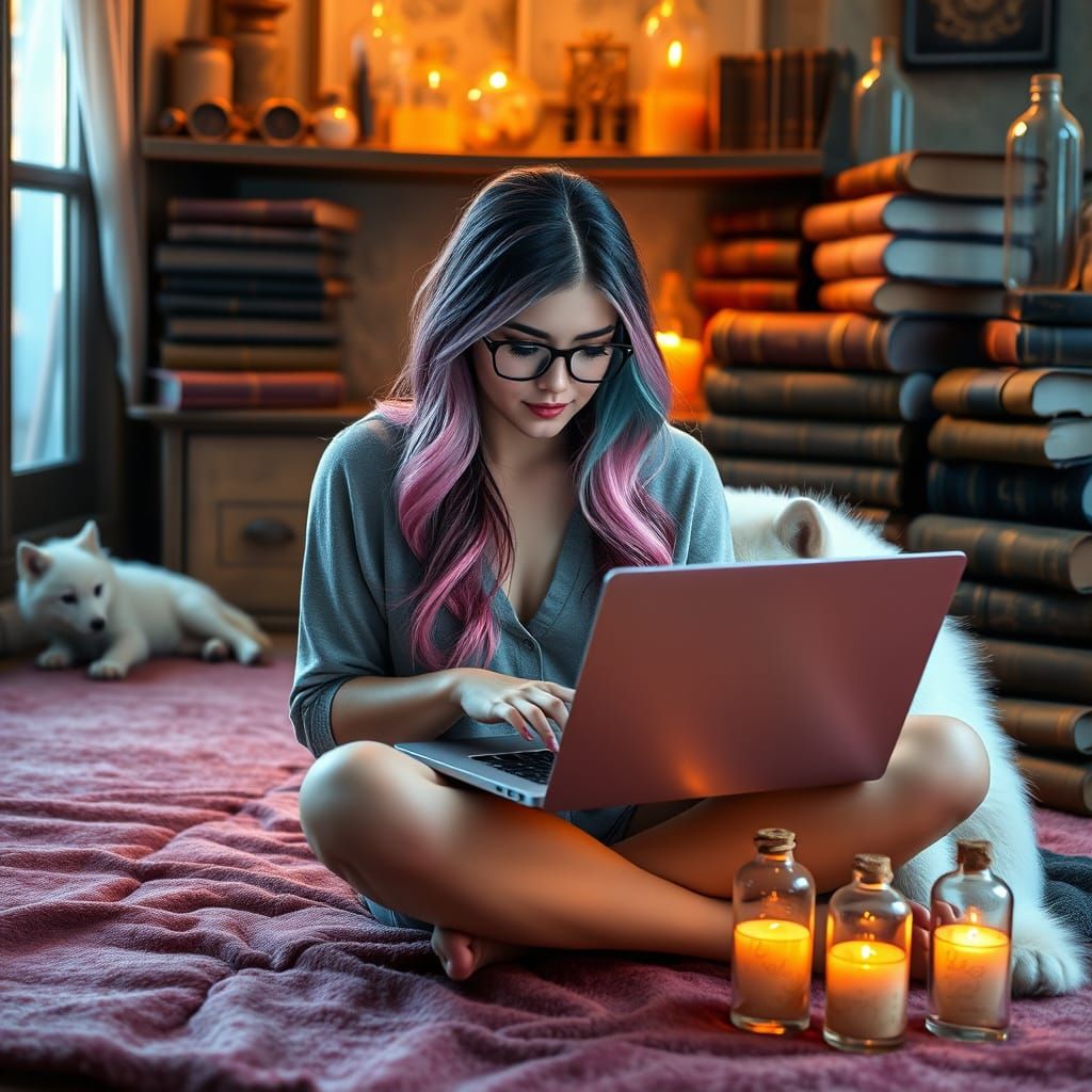 This enchanting image depicts a serene, mystical woman with hypnotic, multi-tonal hair, surrounded by a treasure trove of curious objects and a playful wolf cub, set against a dreamlike, fantastical backdrop with a touch of Art Nouveau elegance.