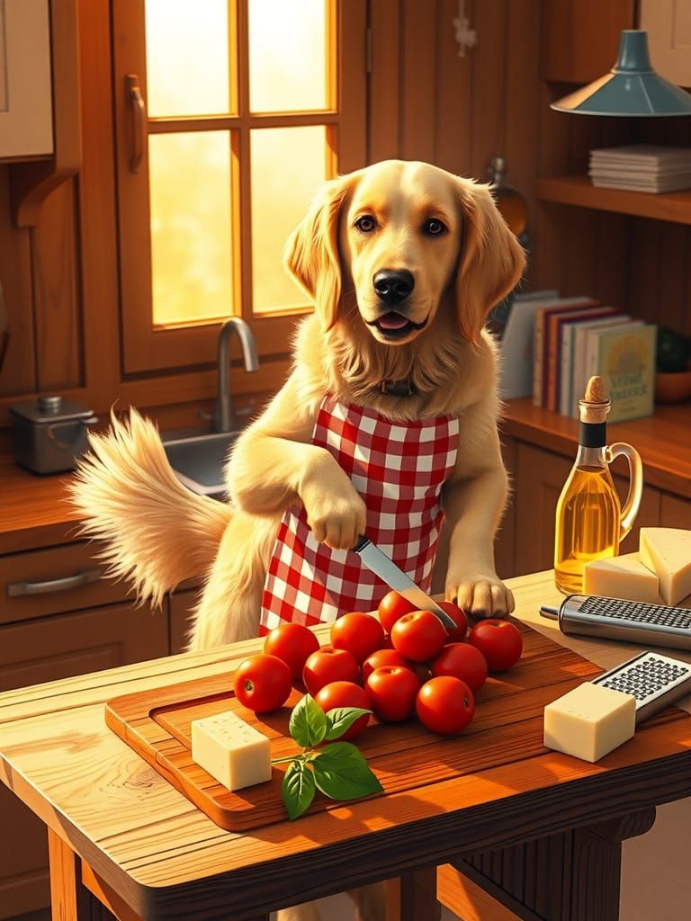 This image captures a heartwarming scene of a golden retriever, Baxter, preparing a meal in a rustic kitchen, surrounded by warm, golden light and an assortment of fresh ingredients, with intricate details reminiscent of Studio Ghibli and Anime Key Visuals