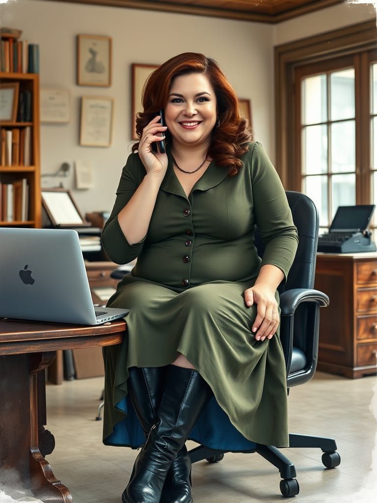 This watercolor portrait shows a curvy brunette woman with an elegant smile, wearing a 1940s midi dress and boots, talking on her phone in a classic office with a typewriter and laptop.