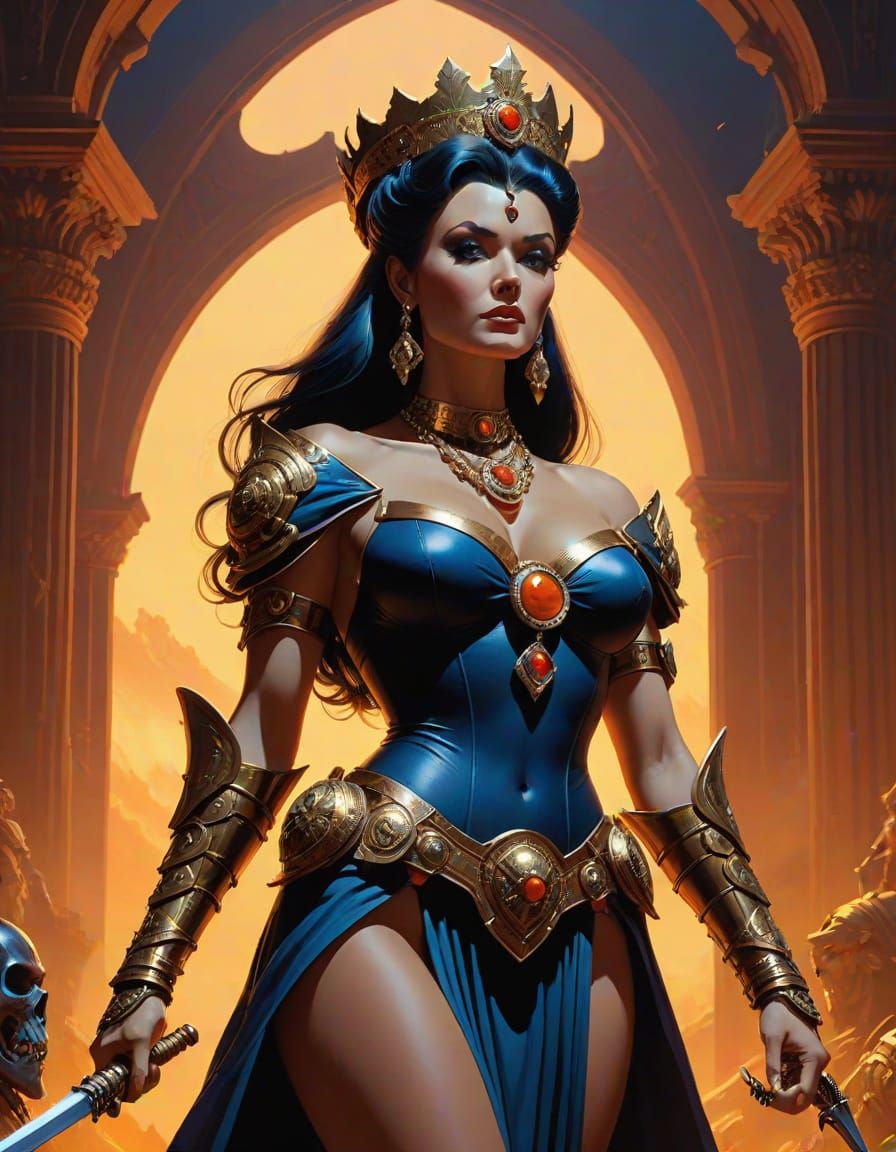 This vibrant, comic book-inspired portrait captures a majestic queen in all her glory, set against a warm, inviting background with hints of red and gold. With intricate details and textures, this epic image embodies the cinematic style of Simon Bisley and Frank Frazetta.