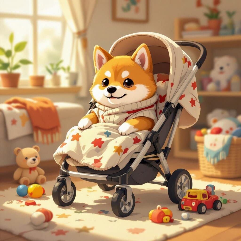 This image shows a Shiba Inu dressed as a baby in a stroller amidst toys and blankets. The artwork evokes a whimsical style with bold lines and vibrant colors.