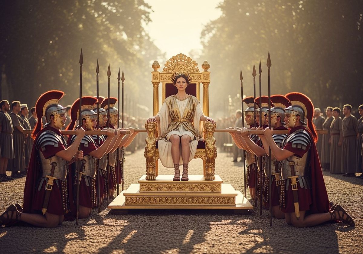 This image shows a Roman Empress on a golden throne carried by legionnaires. People kneel before her in homage, bathed in soft, warm light with a shallow depth of field, creating a photograph with sharp focus and high resolution.