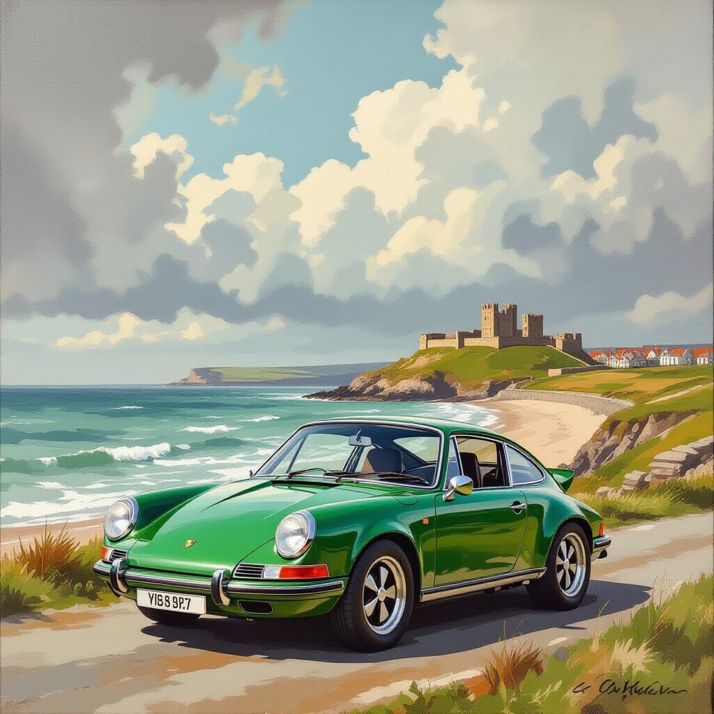 A striking picture of a vintage Porsche 911 Carrera RS 2.7 parked on a scenic overlook. The image evokes an oil painting with muted earthy tones and expressive brushstrokes.