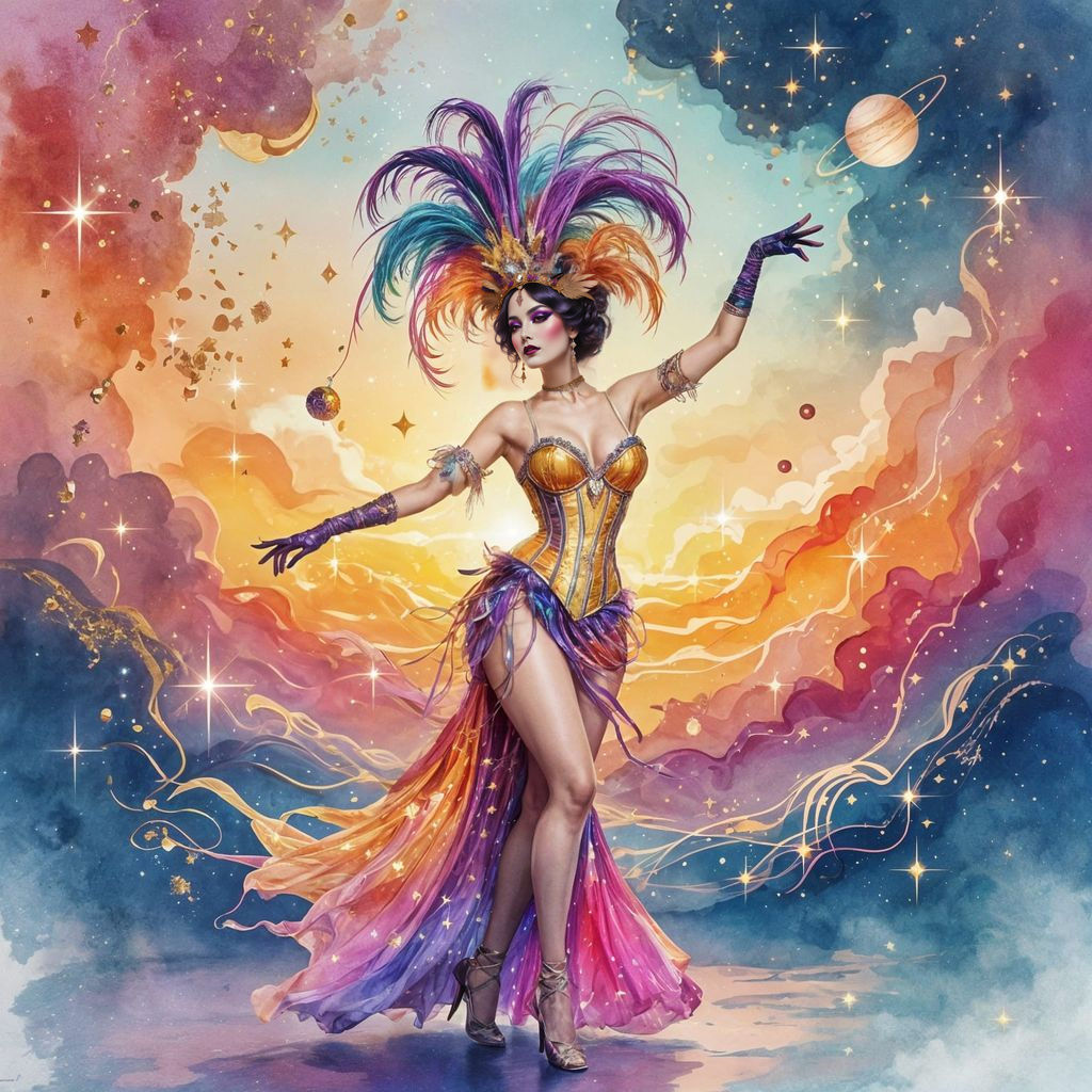 "A mesmerizing 19th-century cabaret performer captured mid-dance, adorned with a lavish feathered headdress and a glittering corset dress that radiates hues of gold, orange, pink, and violet, glowing like a neon sunset. The backdrop is an abstract dreamscape, blending fluid alcohol ink and watercolor-style textures where colors flow and merge like melting clouds over waves, highlighted with shimmering flecks of glitter and sequins. Subtle celestial elementsโplanets and twinkling ..."