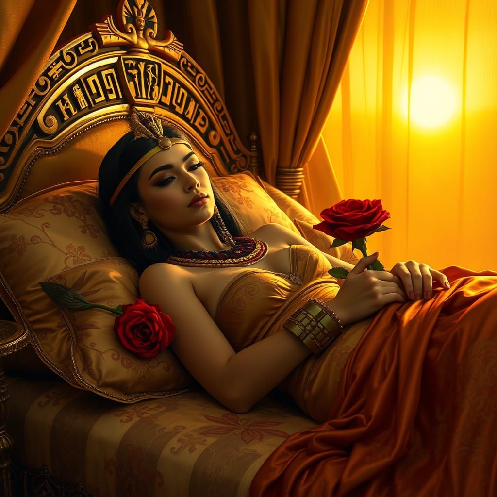 This image shows a regal Egyptian queen reclining on a lavish golden bed, surrounded by opulent silk drapes and adorned with intricate hieroglyphics. A delicate red rose glows softly on the plush pillow beside her, in a style reminiscent of Romantic-era masters.