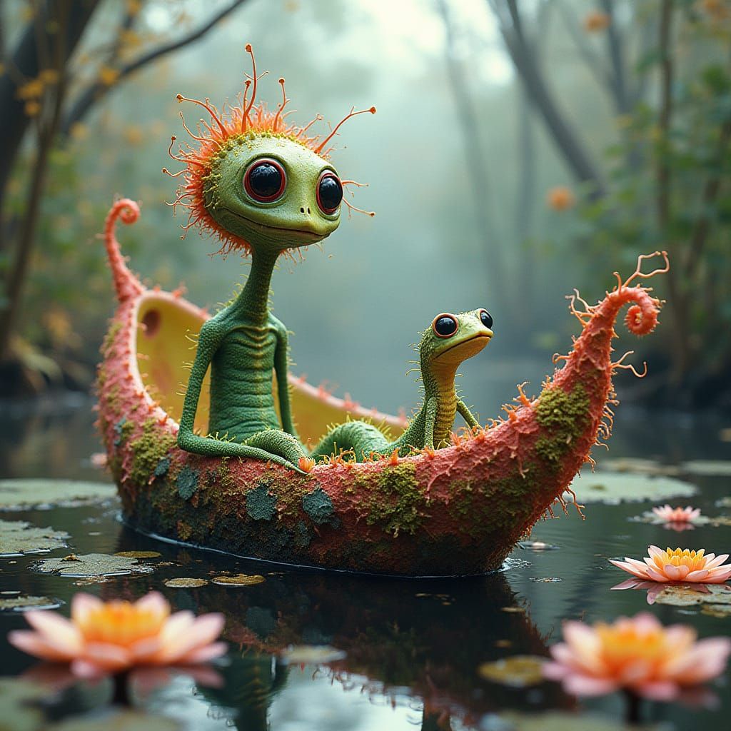 A vibrant image showcasing a futuristic lichen boat adorned with rainbow fractal patterns. The scene features a cute plant creature with large eyes and a small newt companion, all rendered with botanical and fractal elements.