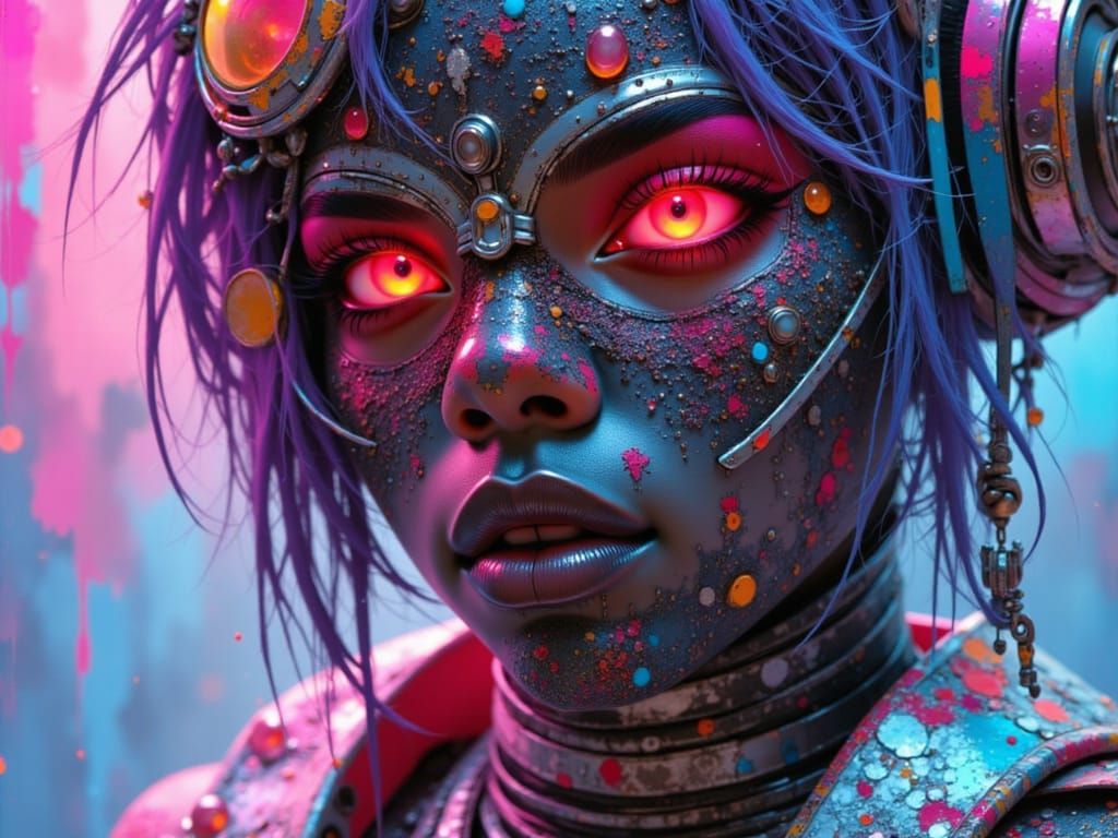 This close-up image features Jimin in a fairycore retro biker style, with unusual pastel colors and a striking neon light wall. The artwork blends mech and techwear elements with intricate African patterns.