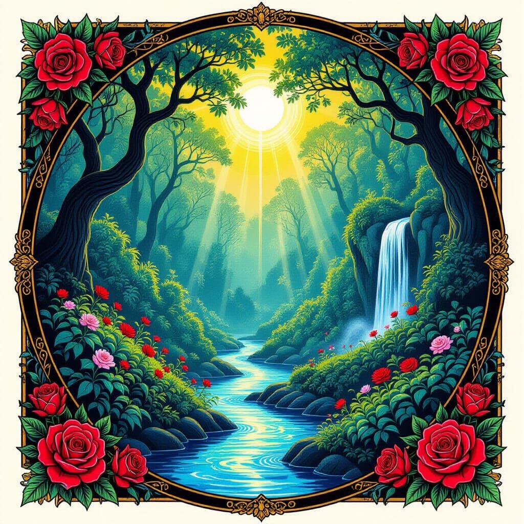This image depicts a surreal, sunlit forest filled with glowing plants and waterfalls, featuring roses and vibrant colors. Created in a unique cartoon-realistic colored pencil style.