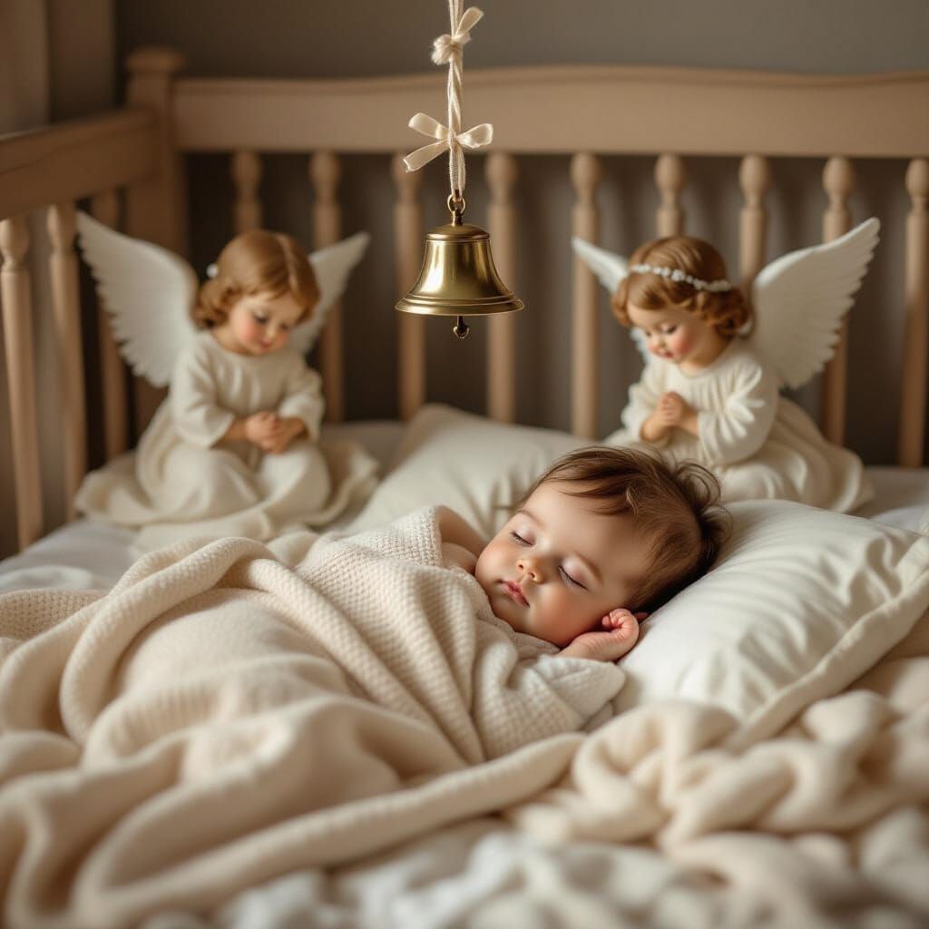 This image depicts a serene baby sleeping in a crib, surrounded by guardian angels. Rendered in a dreamy, antique sepia photographic style with intricate detail, it evokes innocence and divine protection.