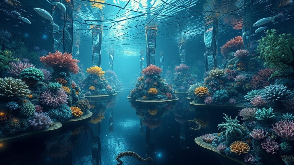 This image shows a breathtaking underwater city crafted from cracked mirrors, reflecting a mystical world of bioluminescent coral and mythical sea creatures against a dark ocean floor.
