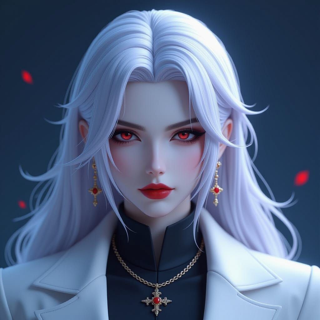 A full body portrait of Alucard from Hellsing, rendered with dynamic lighting and intricate detail. The image showcases triadic colors in a hyperdetailed digital art style.