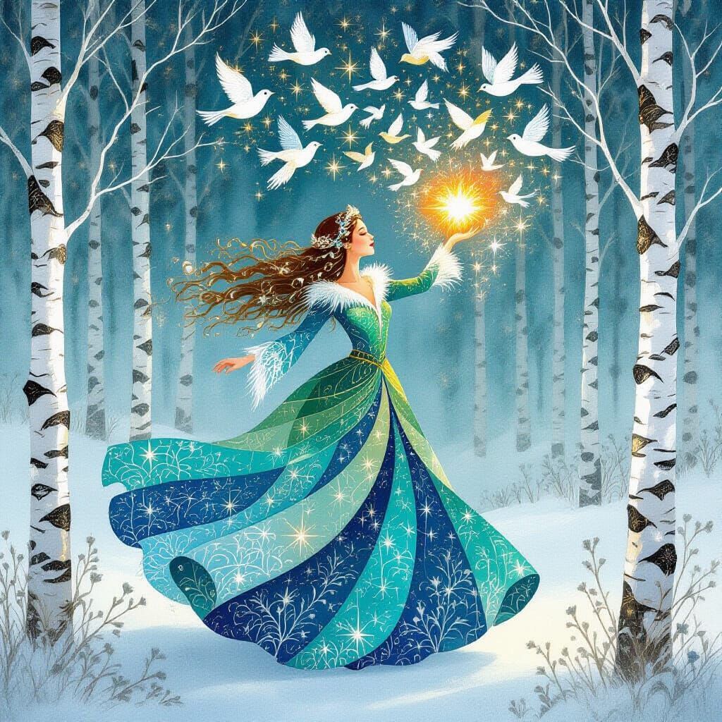 This image shows a woman in a flowing dress dissolving into birch trees as birds fly from her heart. The artwork is a blend of watercolor and Klimt-inspired gold swirls with soft, ethereal brushstrokes.