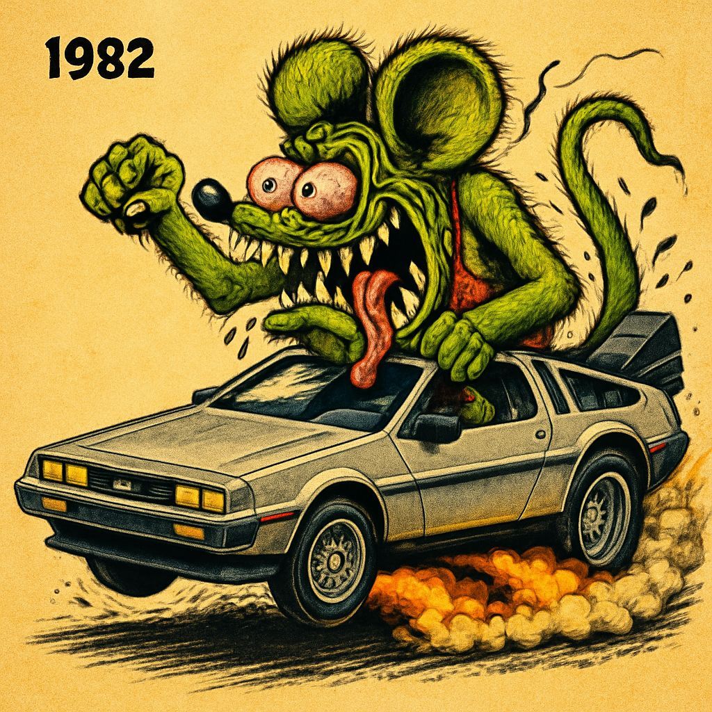 This image depicts a retro-futuristic scene from 1982, featuring a grotesque monster driving a DeLorean car in a stylized illustration.