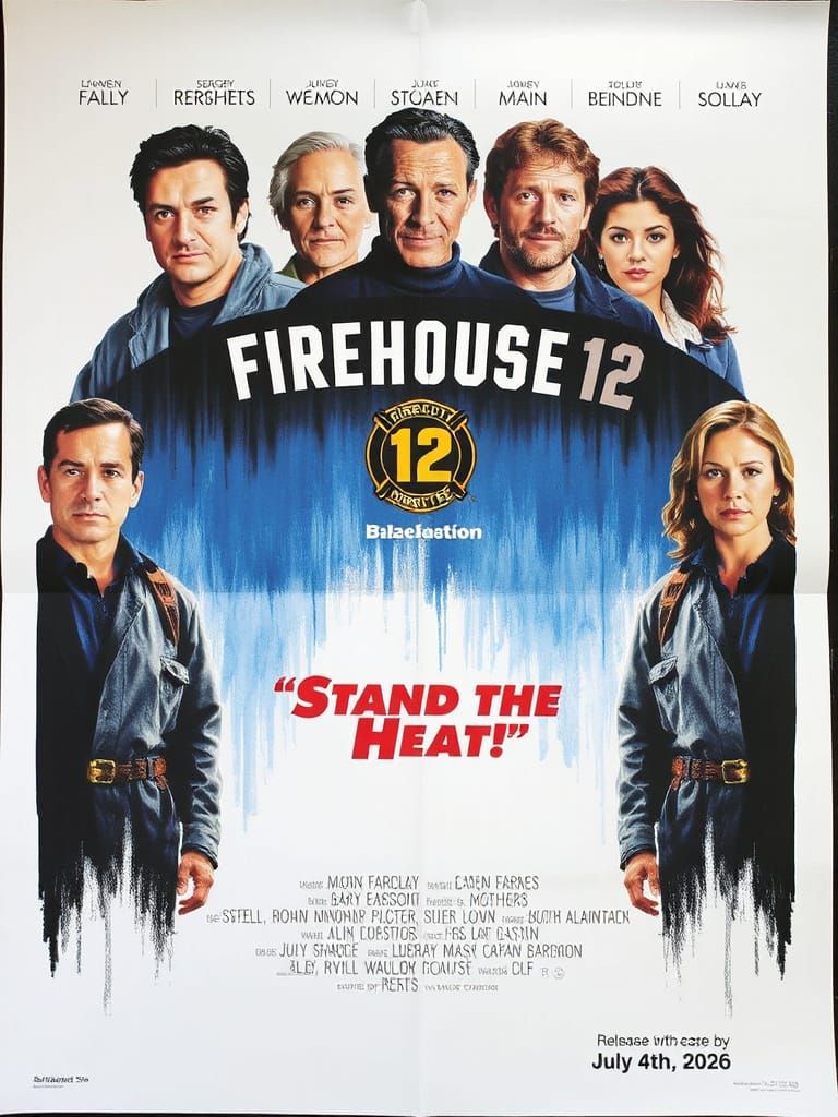 This image shows a vintage hand-painted movie poster reminiscent of the early 1980s. The poster features a firehouse theme, prominent title, actor names, tagline and release date.