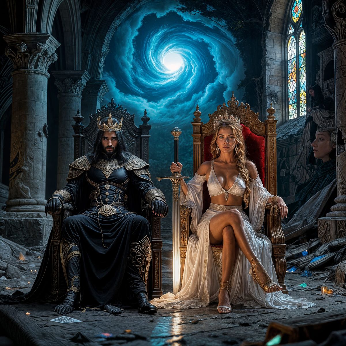 This image depicts a regal king and queen seated together on their ornate thrones, embodying royal authority and companionship.