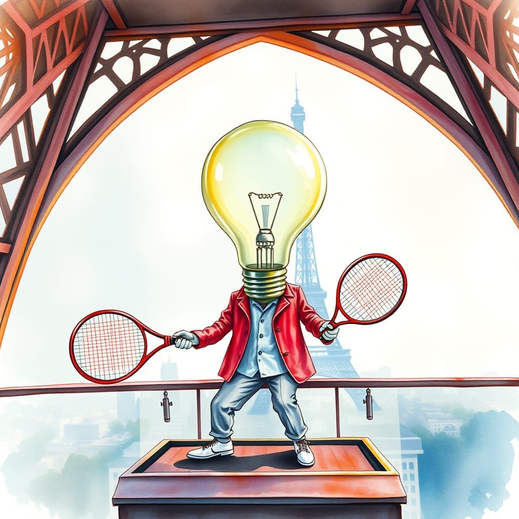 This image shows a dizzy lightbulb character with a face, dressed in cool tennis attire, playing a match on the Eiffel Tower's top floor, rendered in a watercolor aesthetic.