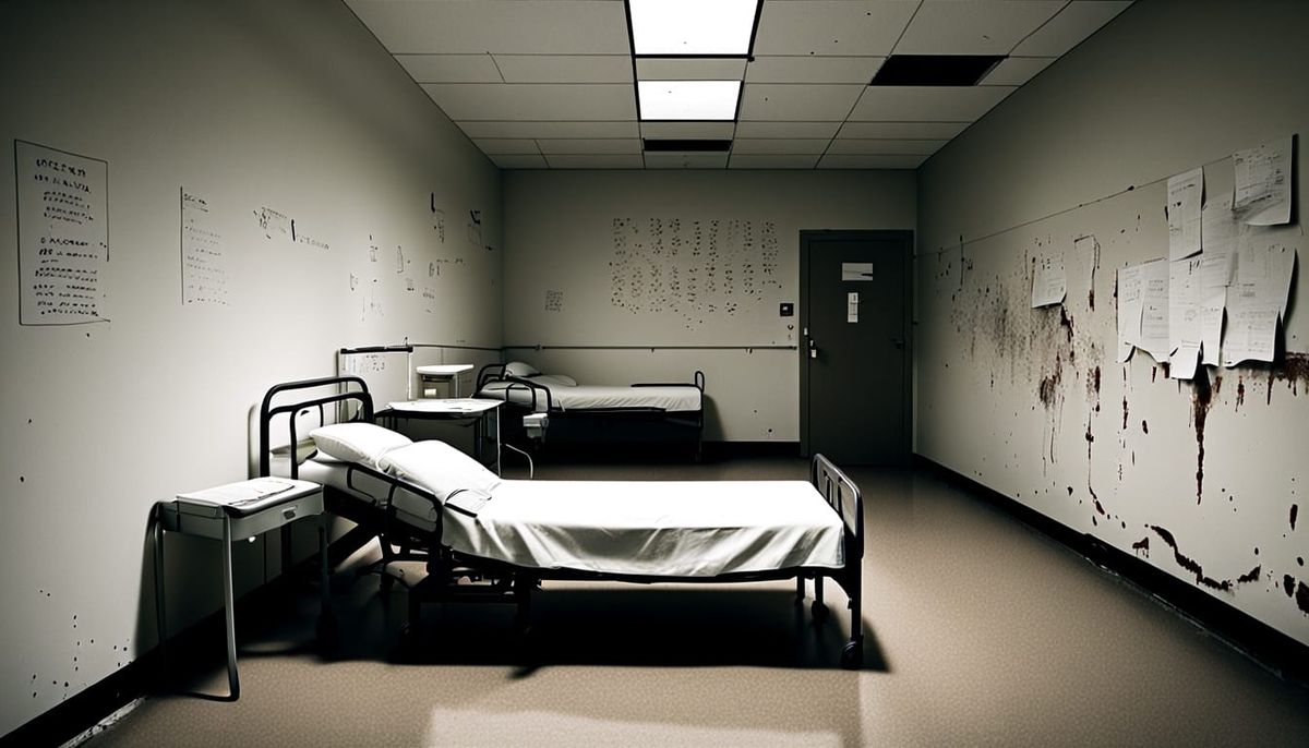 This image depicts a desolate hospital room. The scene features a rusted bed, minimalist aesthetic, and raw textures, illuminated by flickering light and exhibiting a cold, desolate color scheme.