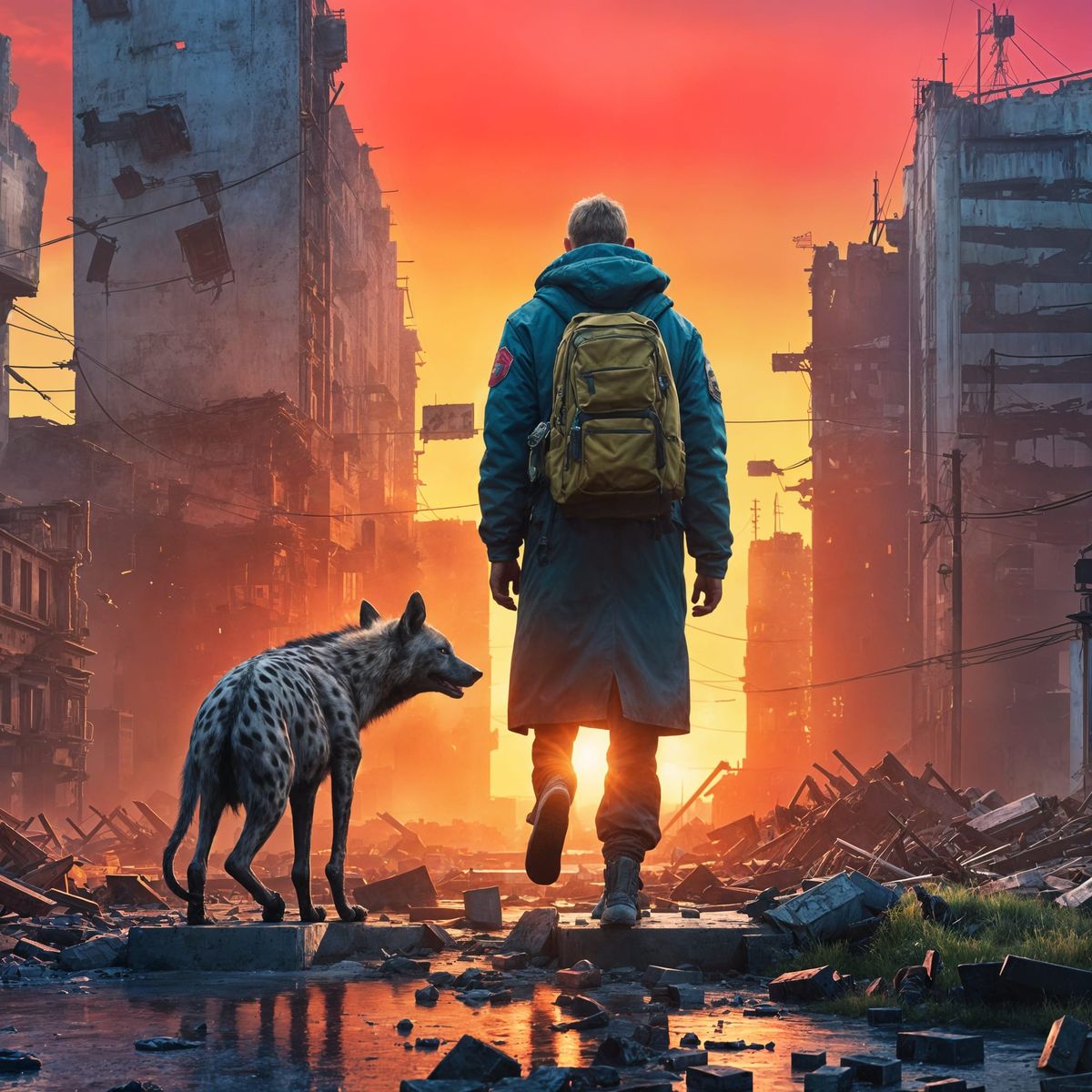 A lone figure with a mechanical arm and hyena companion explores a ruined cityscape. This image evokes photorealistic expressionism with a dramatic sunset, rendered as 3D digital art.
