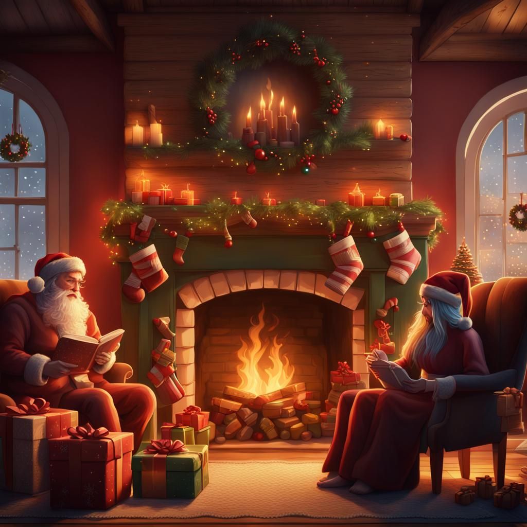 A heartwarming Christmas morning scene of loved ones exchanging handmade gifts by a fireplace. This detailed matte painting captures the joy and love of the holiday season in deep, complementary colors.