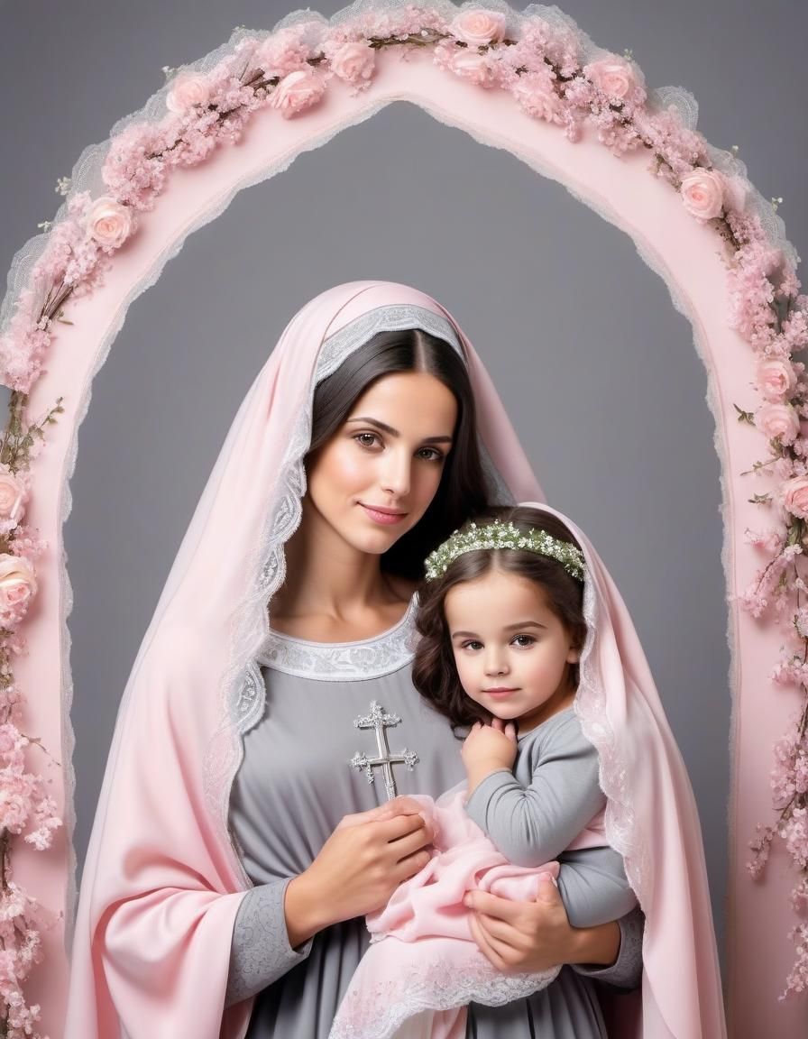 This image depicts a youthful Virgin Mary with her mother, Saint Anne. Mary is dressed in a powder pink tunic, while Anne wears a gray tunic and veil, portraying a tender moment of motherhood.