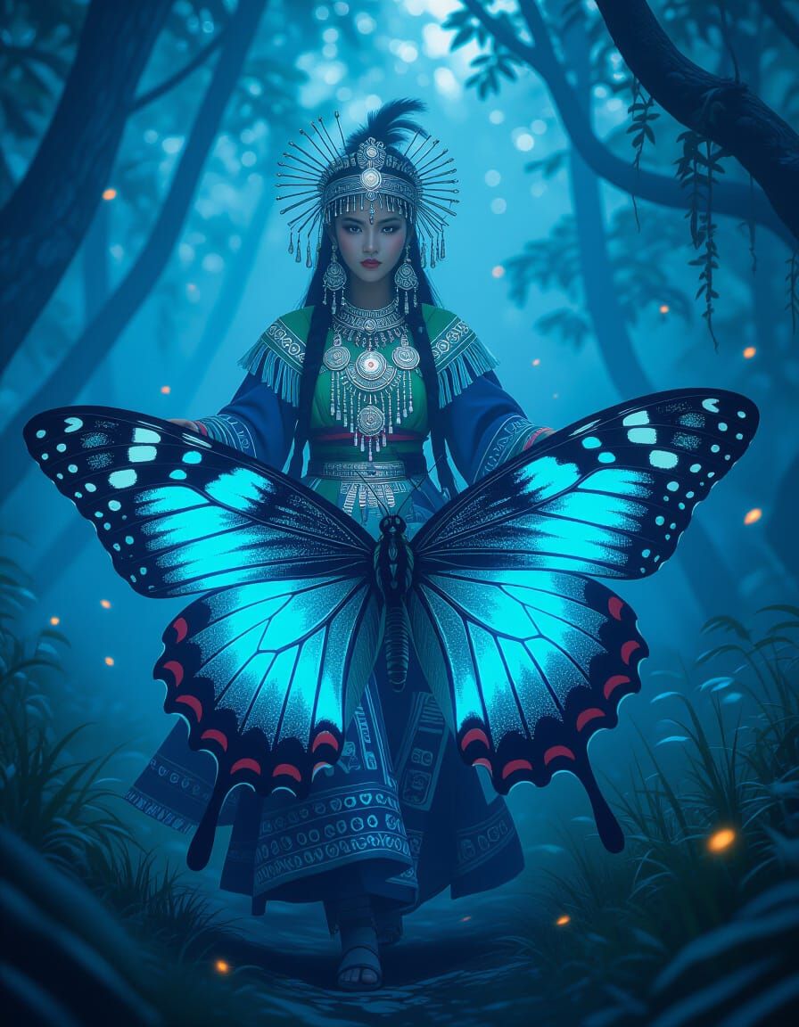 A striking picture of a Hmong shaman woman with silver jewelry, riding a glowing butterfly in a misty forest. The image has an elegant art nouveau aesthetic with precise digital painting techniques.