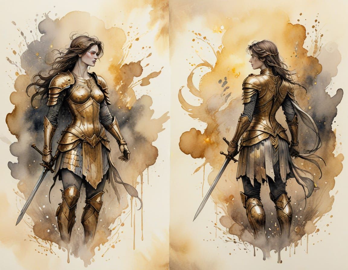 A watercolour and ink drawing of a romantic warrior in a misty forest. The artwork features delicate ink lines, soft watercolour textures, and a warm, golden light.