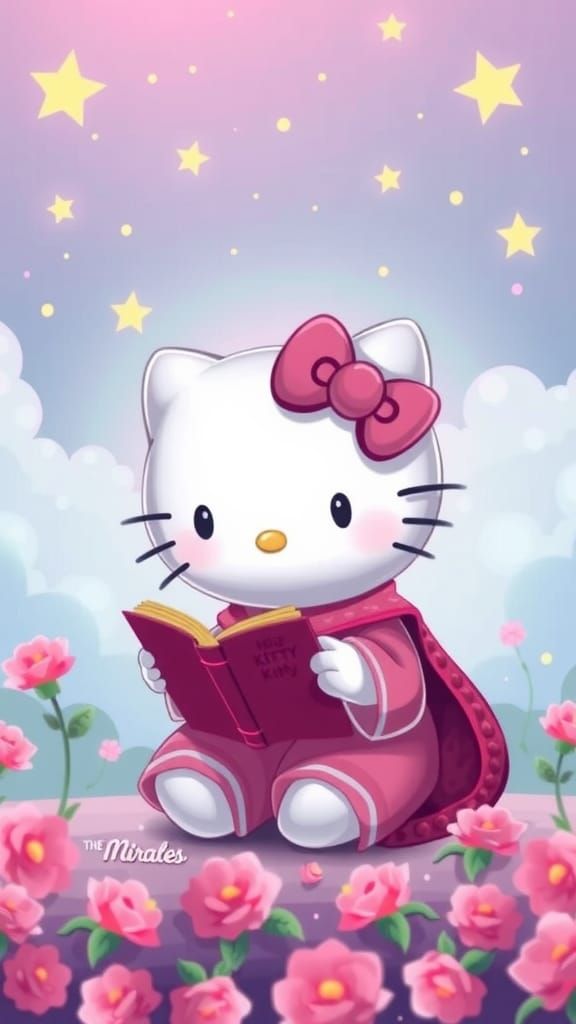 This image shows Hello Kitty engrossed in reading "A Course in Miracles." The simple composition focuses on the character's studious demeanor.