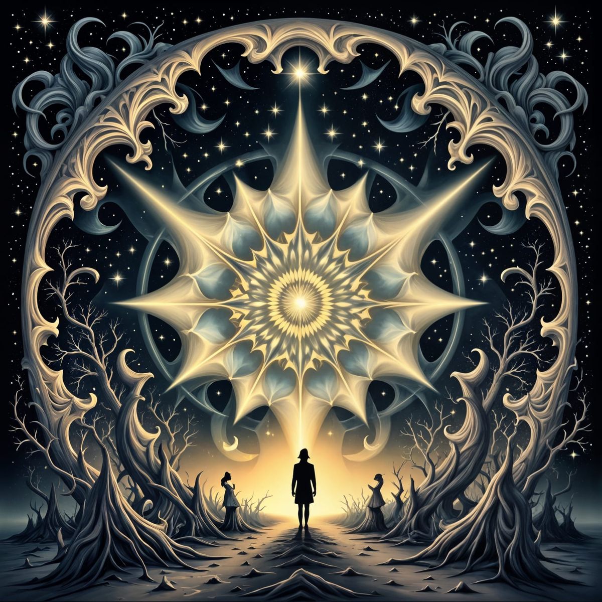 This image features a solitary figure casting long shadows, rendered in a high-contrast film noir style with surrealist elements and dramatic lighting. It evokes a sense of mystery and wonder.