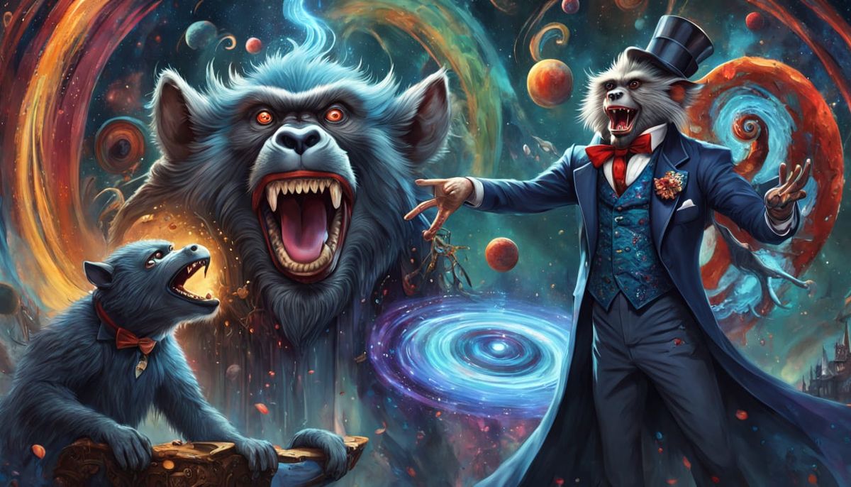 A striking picture of a baboon-headed ringmaster gesturing to a vortex of cosmic goo. The image features intricate details, vibrant colors, and a psychedelic, chaotic aesthetic inspired by Hieronymus Bosch.
