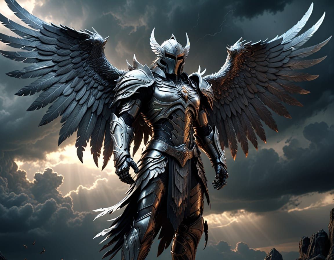 This image shows a full-bodied Death Angel standing against a backdrop of dark, ominous clouds. The angel has intricately detailed wings and wears shining silver armor, rendered as 3D animation.