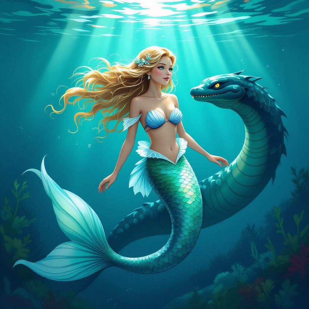 A captivating image of a mermaid with a shimmering tail swimming alongside the Loch Ness Monster. The scene is rendered with soft, ethereal lighting and delicate water effects, in a fantastical style.
