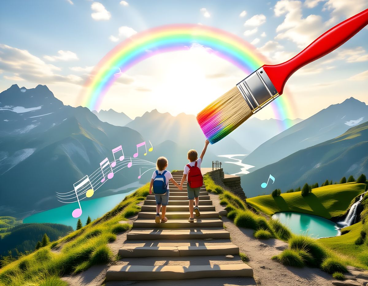 This image depicts a giant paintbrush creating a magical staircase to a rainbow's end, with children ascending. Features a mountain landscape and pastel colors.