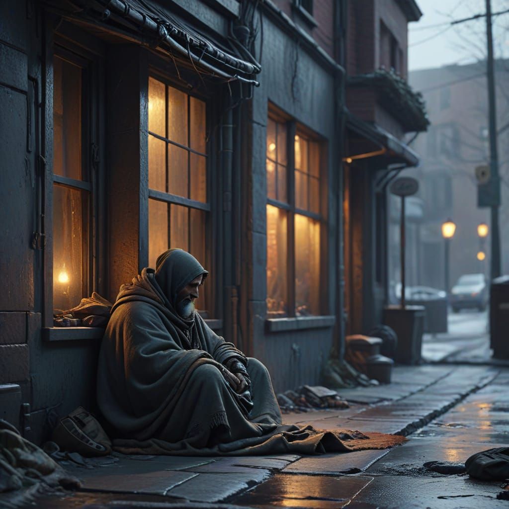 This detailed matte painting shows a homeless person finding shelter on a quiet street. Muted tones and deep colors create a somber atmosphere, with warm light from a window offering a touch of hope.