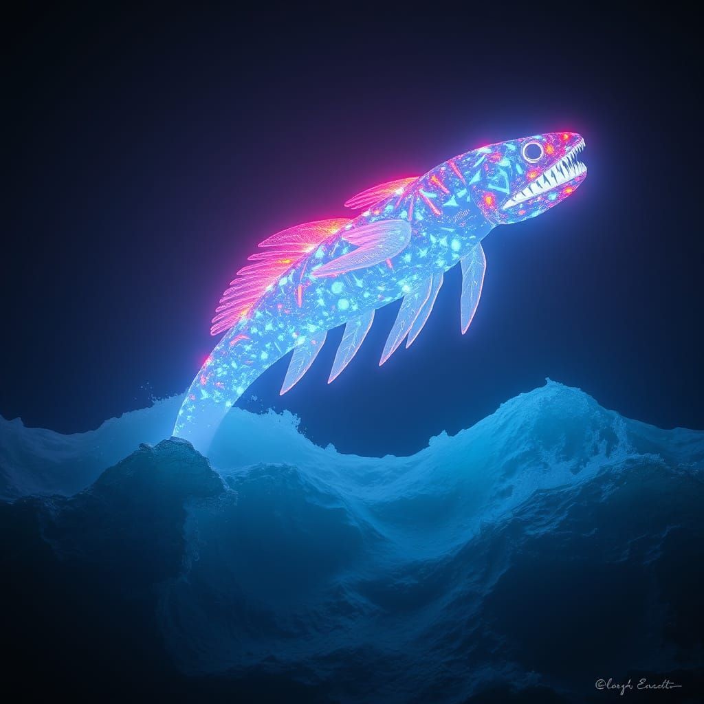 This image shows an enormous electric eel glowing in the dark depths of the ocean, with iridescent colors and organic textures, inspired by futuristic art styles