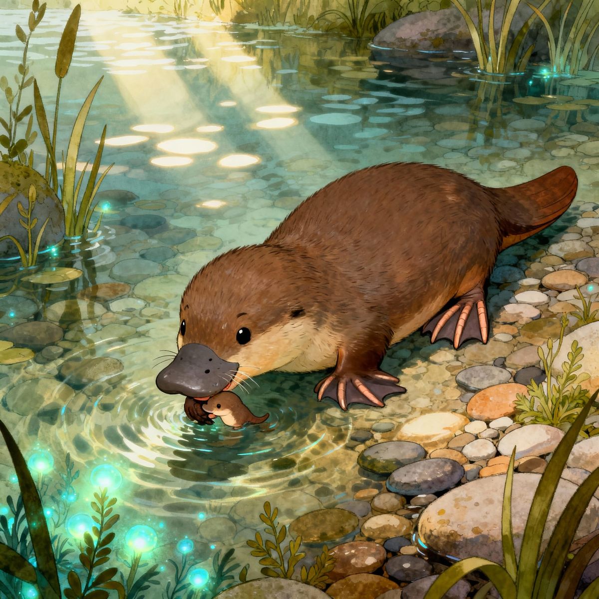 This charming illustration shows a mother platypus feeding its baby in a shallow river. Dappled sunlight and glowing flora create a whimsical scene with soft textures.