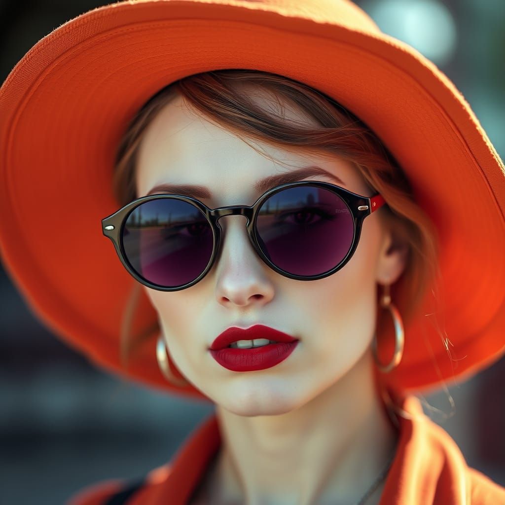 A close-up portrait of a woman with striking features. She wears large, round sunglasses with a purple tint. Her skin is pale, and her lips are painted a deep shade of red. She dons a wide-brimmed hat in a rich shade of orange.