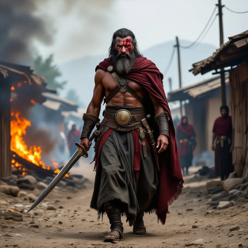 A powerful image of an ancient Turkish warrior, wounded but honored, departing a village he has just destroyed in retribution for his wife's death.