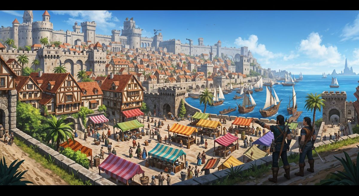This image shows a vibrant port city beneath a bright blue sky, showcasing a blend of stone fortresses and colorful buildings. Lush foliage and a bustling marketplace add to the scene. The artwork evokes high-fantasy concept art.