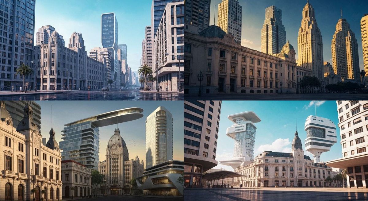 Generate your own stunning cityscapes in various architectural styles, inspired by Montevideo's iconic buildings. Free and easy to use!