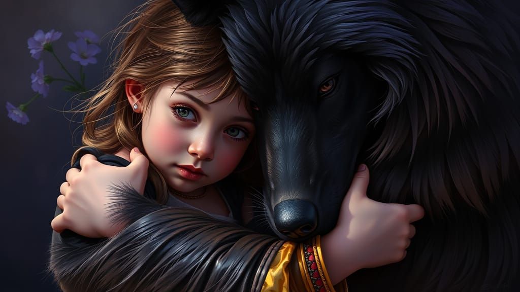 This oil painting captures a tender moment between a young girl and a large fantasy wolf, rendered with intricate detail and volumetric lighting. The artwork features a rich palette of purple and yellow hues.