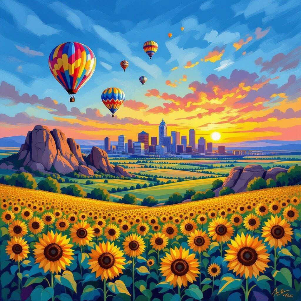 This image shows a vibrant Kansas landscape featuring rocky formations and colorful hot air balloons under a dramatic sunset. Rolling green farmlands and sunflower fields complete this painterly scene.