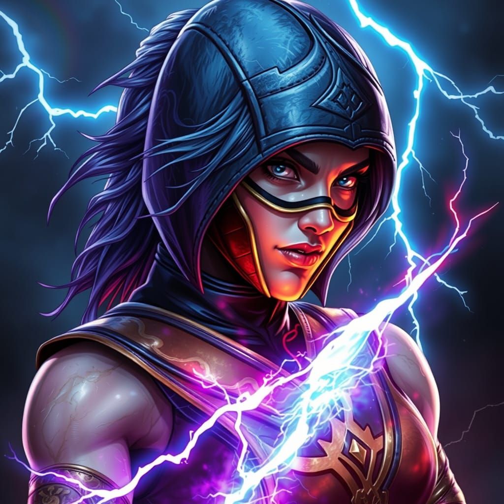 This image depicts a gender-bent, female version of Raiden from Mortal Kombat amidst a fierce storm. Lightning illuminates the flash flood, rendered in deep, vibrant colors.