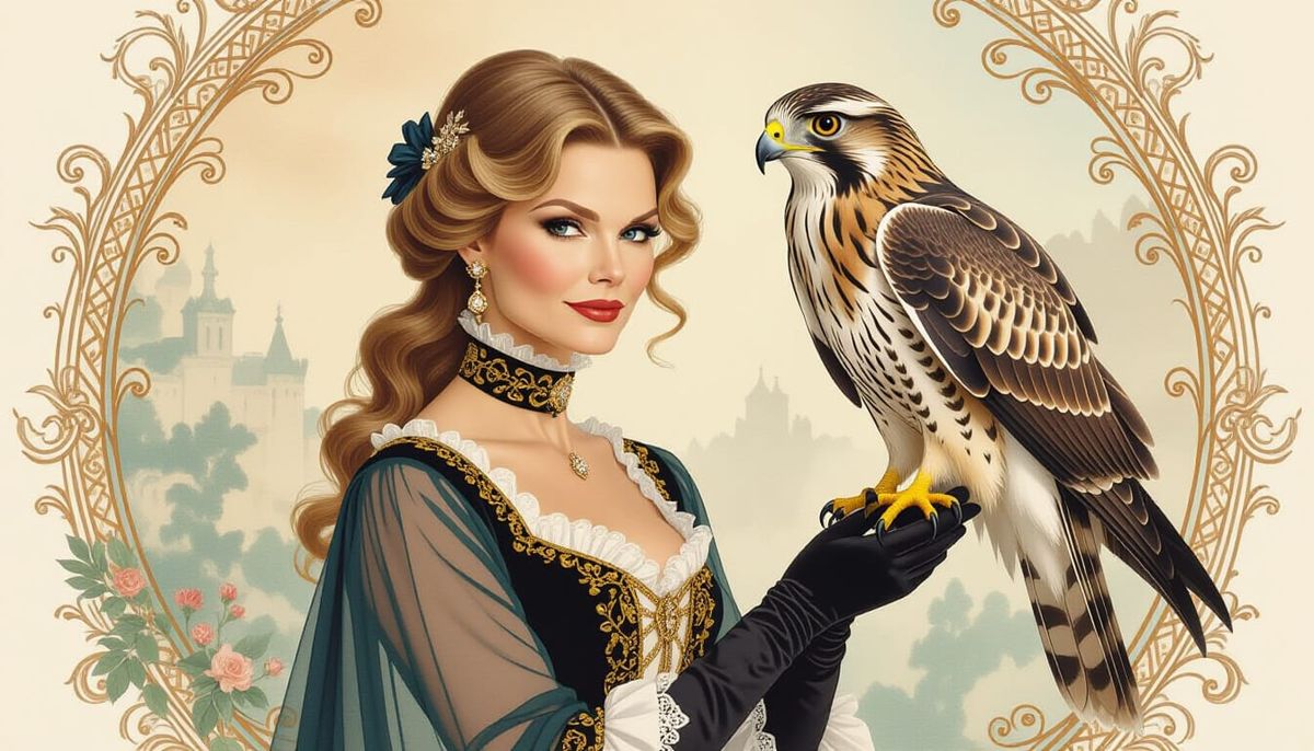 A captivating portrait of Michelle Pfeiffer with a hawk, in an elegant dress, set against a fantastic backdrop. The image is styled with soft watercolor textures and intricate lines.