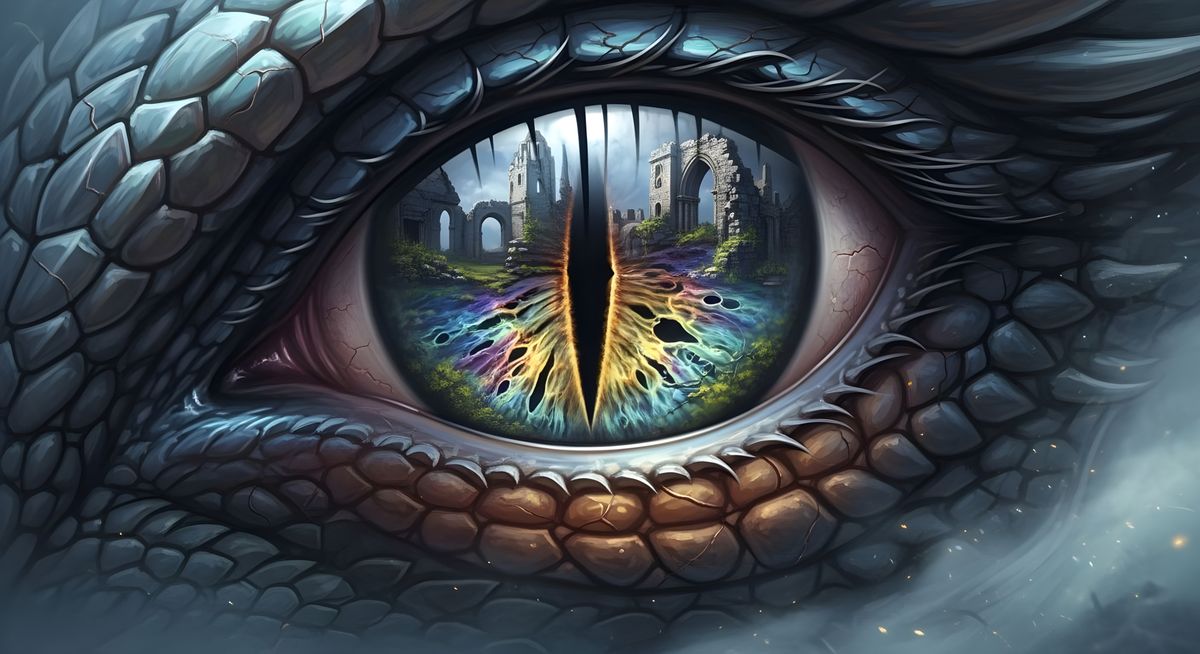 This image shows a macro shot of a dragon's eye. Reflected in the pupil are the crumbling remains of an ancient castle, hinting at tales of fire and destruction.