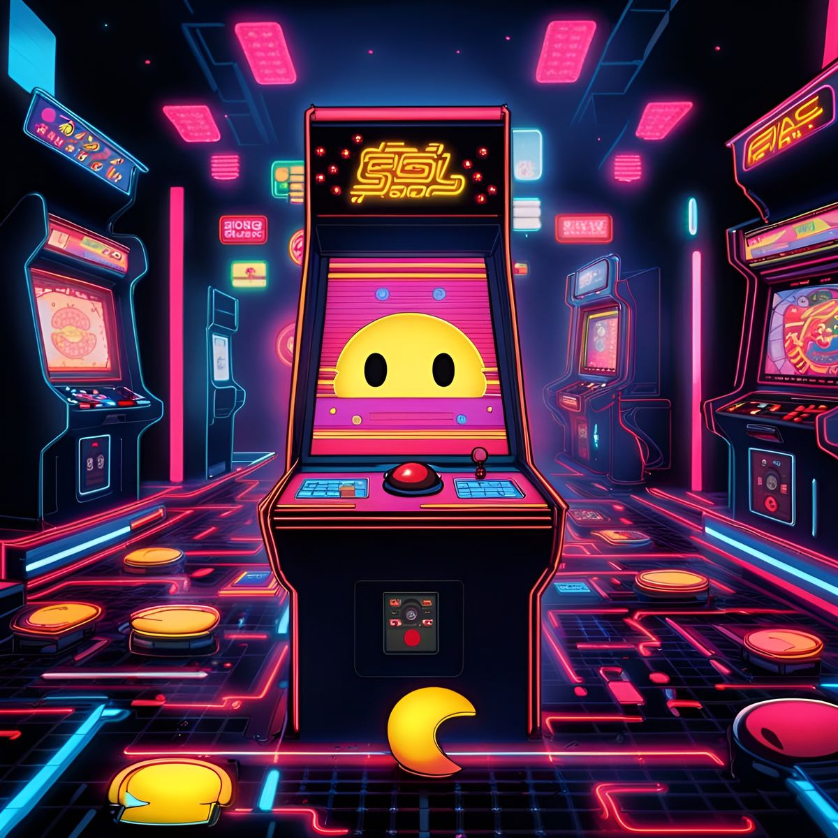 This image showcases an empty retro 80s style arcade filled with classic games and neon lights. The scene is rendered in a vibrant, anime-inspired style.