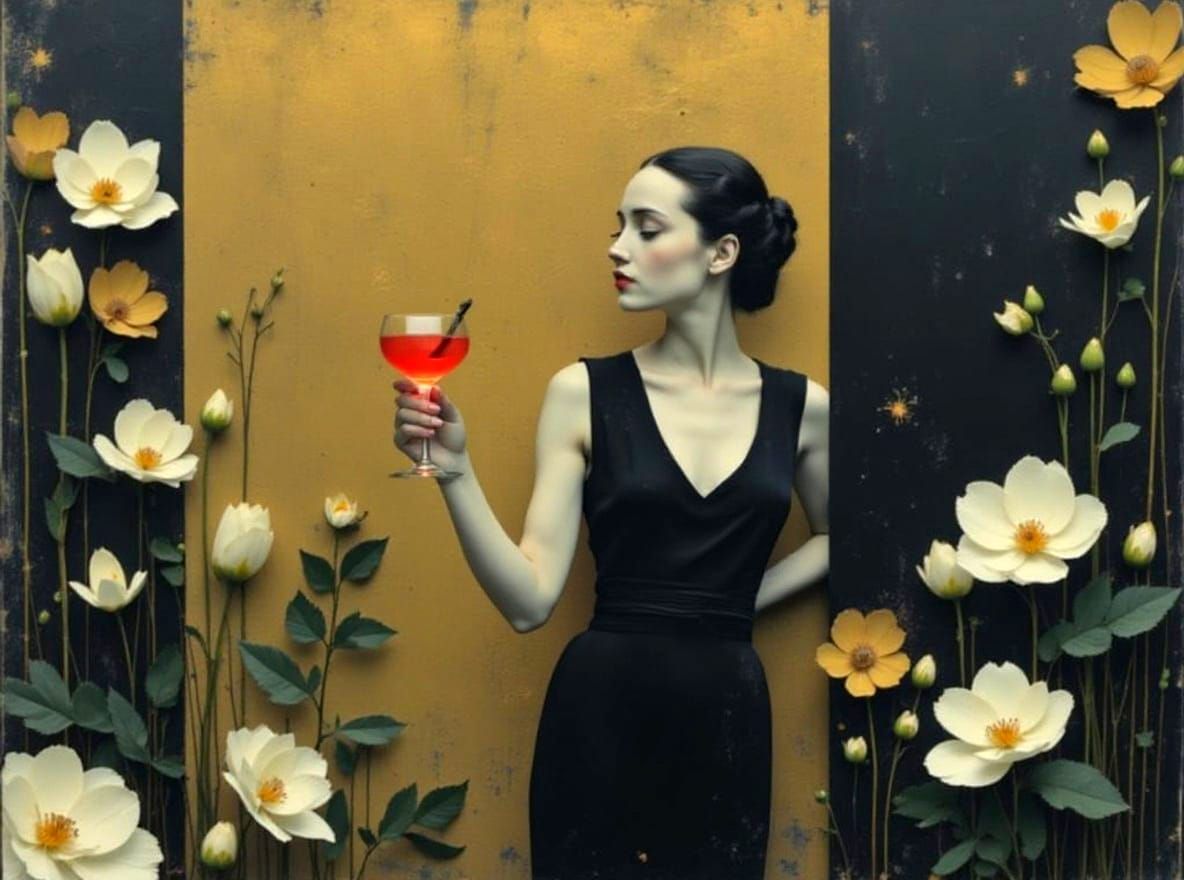 A digital matte painting of an eye overlooking a 1940s nightclub scene. The image features an art deco aesthetic in black, white, and gold with impasto textures.