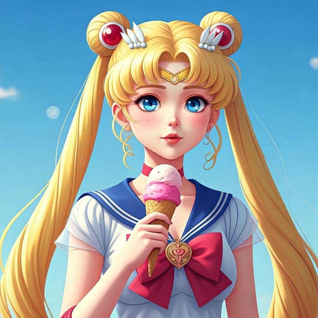 This image depicts a 3D anime-style girl in a Sailor Moon-inspired outfit enjoying an ice cream cone on a sunny summer day. The artwork is highly detailed with an aesthetic concept art feel.