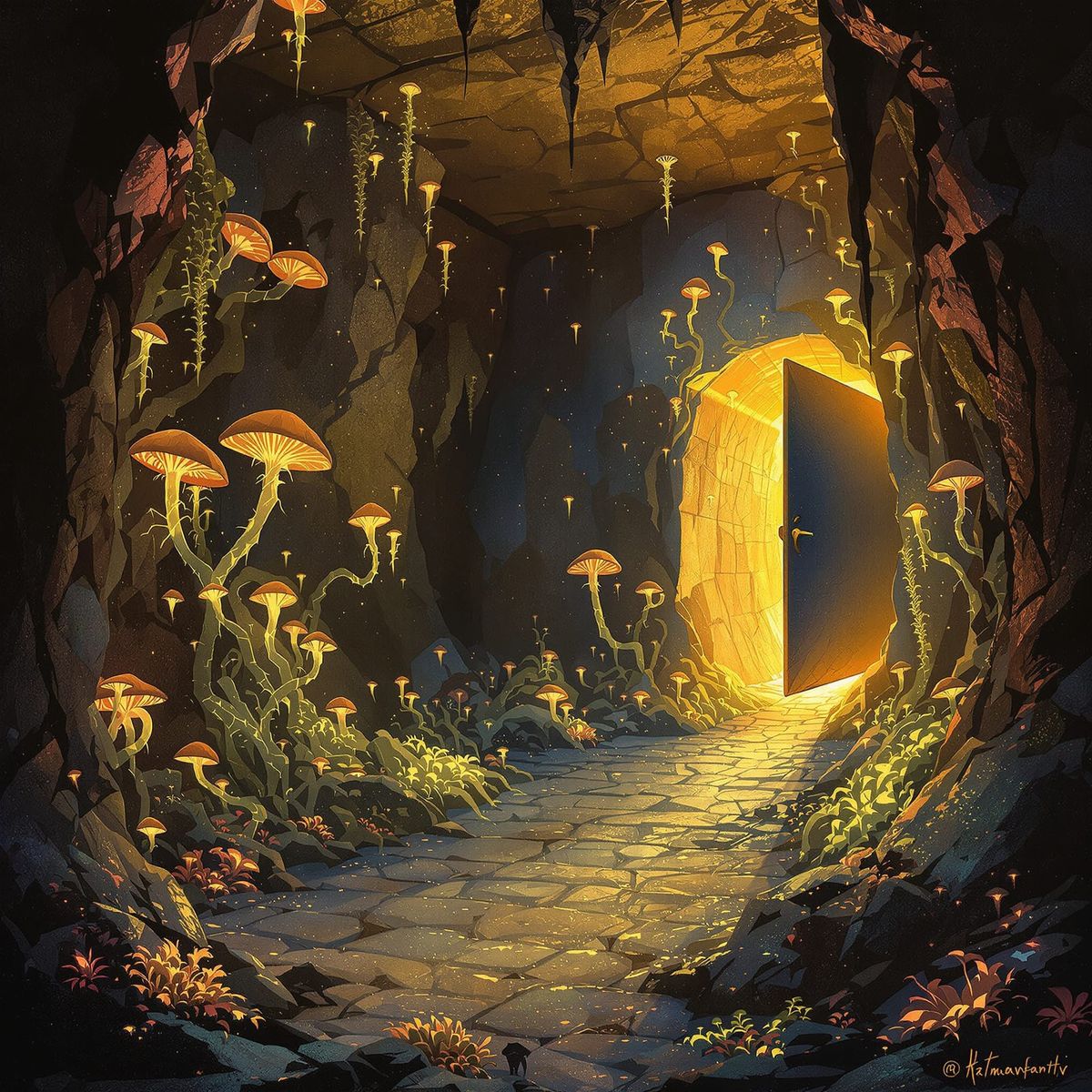 This image shows a pharaoh's tomb dramatically opened, revealing a glowing ecosystem of bioluminescent fungi and strange insects, rendered with impressionistic brushwork.