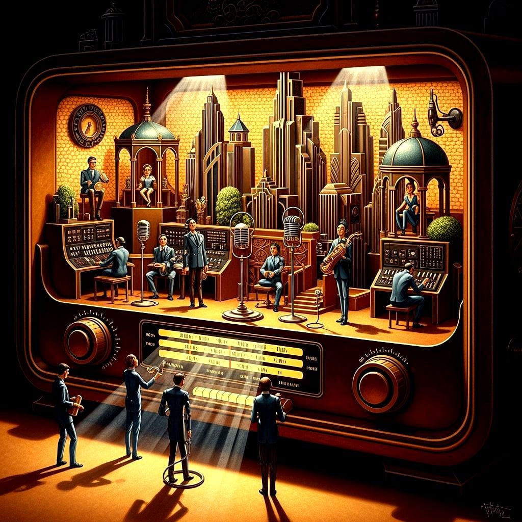 This image shows a miniature kingdom flourishing inside an antique radio, with small figures sending out music and news. The scene is rendered in art deco style with bronze and gold tones, and dynamic lighting.